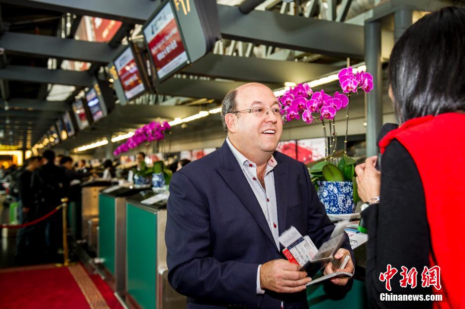 12月12日,正在办理登机手续的外国旅客Gasarch有幸成为了广州白云国际机场2013年度的第五千万名旅客。广州白云国际机场2013全年旅客吞吐量有望达到5200万人次左右,首次跻身全球“五千万级”机场。此外,白云国际机场的全球客流量排名有望晋升至第15位,进入世界超大型航空枢纽行列。中新社发 龙宇阳 摄