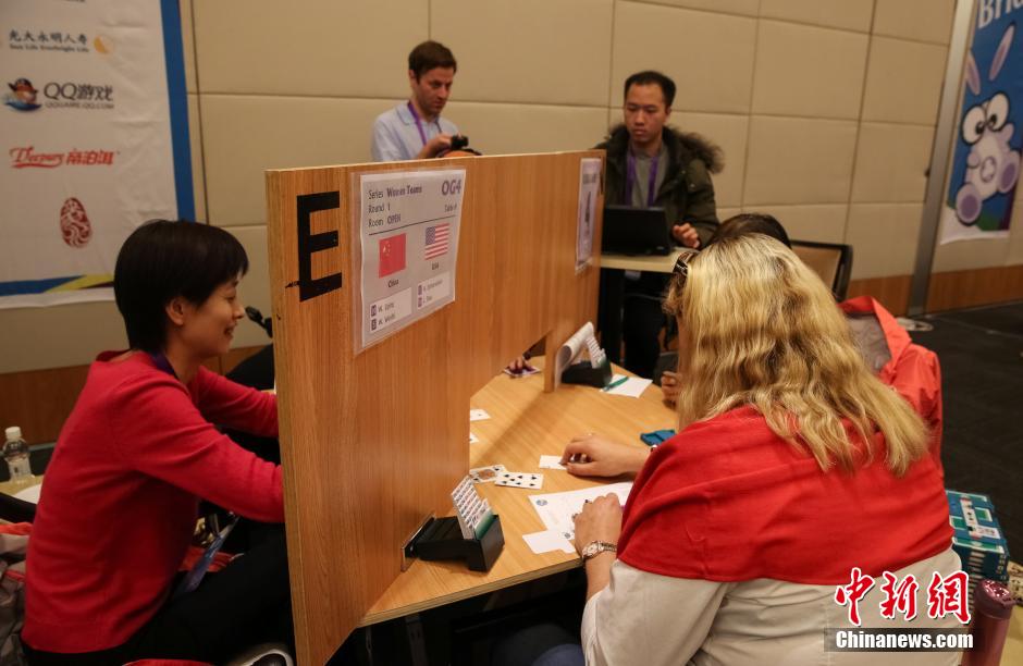 12月12日,中国与美国的选手正在进行女子桥牌团体赛的比赛。当日,2013世界智力精英运动会在北京开赛,来自近40个国家和地区的150多名世界顶尖选手将在国际象棋、桥牌、围棋、国际跳棋、象棋的比赛比赛中展开角逐。比赛为期七天。中新社发 熊然 摄