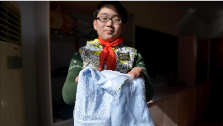 11月26日,记者走访了无锡市夹城里实验小学,该校是一所民工子弟小学,近80%的学生为外来务工人员子女。学校于2010年正式成立了科技社团,学生们主要以发明和创新实用型作品为主,三年来已获得百余项国家实用新型专利证书,其中70%以上获专利的为民工子女。据该校老师介绍,很多学生家长从事工匠、泥瓦匠工作,学生受到家长工作启发更容易发明一些实用型作品,而且民工子女动手能力更强一些。图为一名学生展示证书。中新社发 李一芳 摄