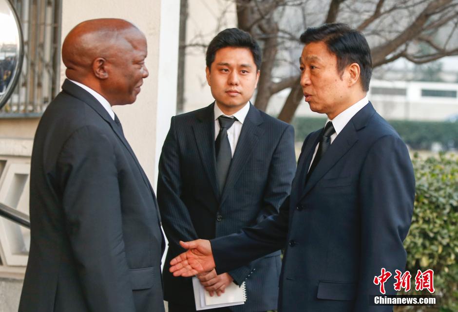 12月6日,中央政治局委员、国家副主席李源潮到达南非驻华大使馆,就曼德拉逝世进行吊唁。图为李源潮和南非驻华大使兰加会面。中新社发 张浩 摄