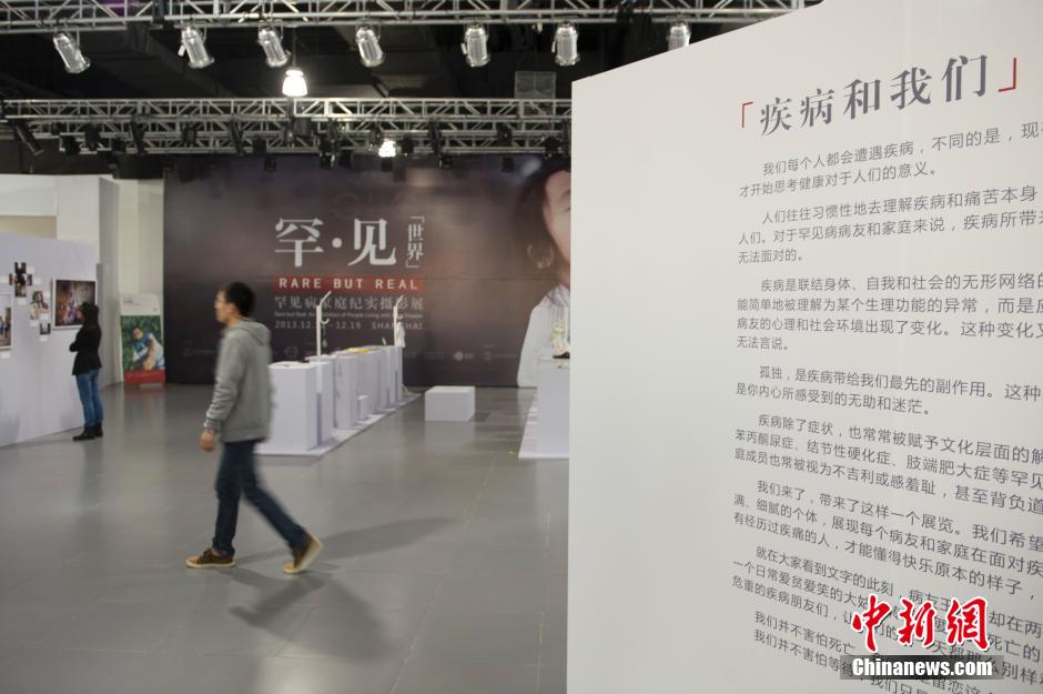 12月13日,《罕·见的世界》纪实摄影展在上海环球港正式对公众开放。据悉,本次影展由中国罕见病发展中心(CORD)策划,由中国大陆16位摄影师历经数月拍摄了中国20个罕见病家庭的生活。本次影展旨在希望可以使更多中国民众了解罕见病、关注罕见病现状。另据了解,本次影展也是中国大陆范围内首次通过纪实摄影展现罕见病群体生存现状的展览。图为影展现场。中新社发 崔楠 摄