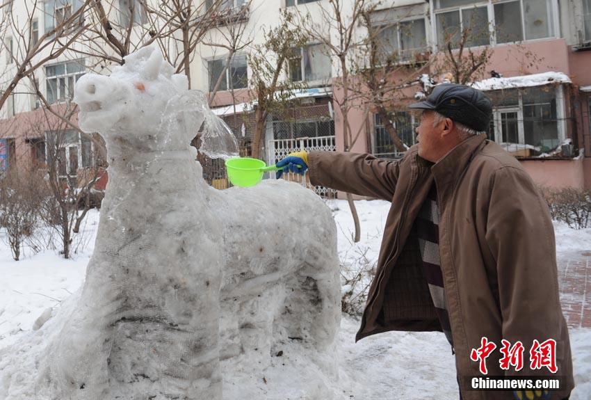 吉林老人小区内自制雪雕群 最长9米成景观