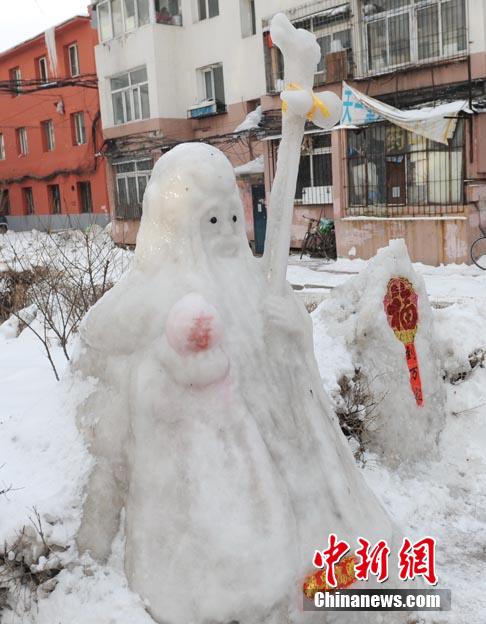 入冬以来,吉林市持续降雪。66岁的吉林市民张学云自己动手在小区内制作了7组雪雕,包括乌龟、兔子、寿星、鲤鱼等造型,其中最大的一座雪雕是长达9米的“中华龙”。这些雪雕成为小区冬日里一道独特的景观。据老人讲,制作这些雪雕,也是祝愿刚做完乳腺癌手术的妻子早日康复。图为雪雕成为小区一景。苍雁 摄