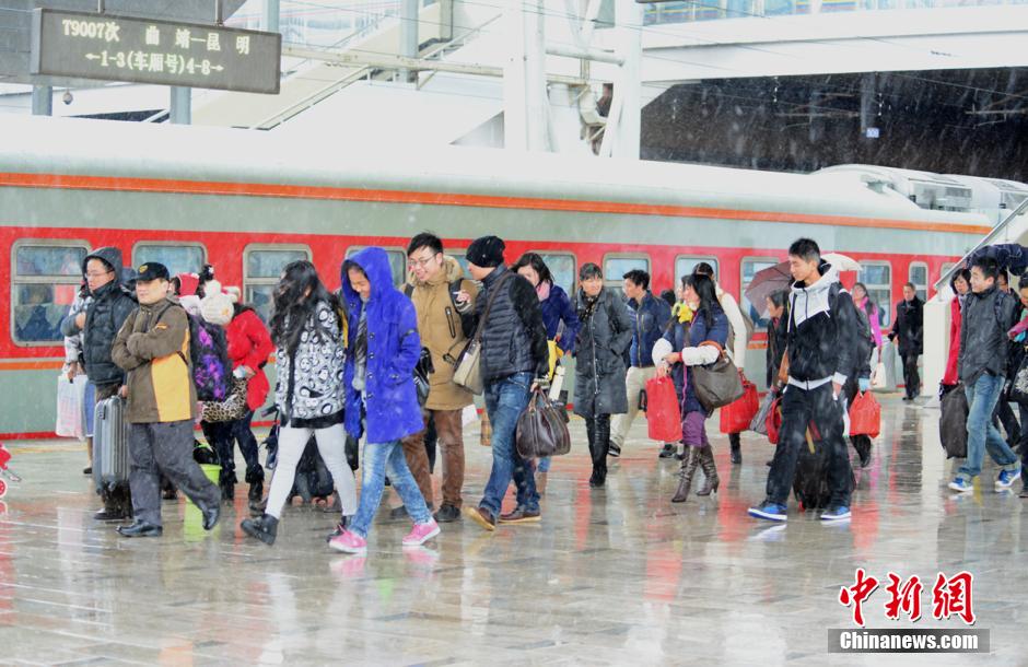 12月14日至15日,云南省多地迎来今冬的第一场雪。昆明铁路局管内沪昆、南昆、水红、威红等铁路不同程度遭遇雨雪和强降温天气,给铁路安全畅通带来严峻考验。为保行车安全,该局启动应急预案,加强运输调度指挥等。图为安全抵达昆明站下车的旅客。中新社发 汪建云 摄