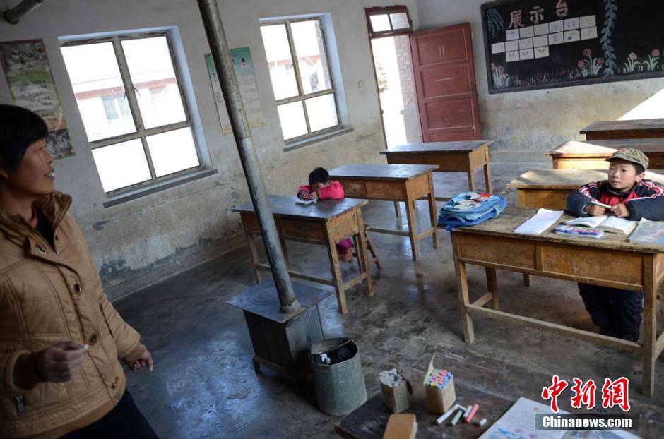近年来,在甘肃境内的大山深处农村,一些乡村小学由于受学生生源影响而变得空荡荡,有的小学学生数量逐年锐减,有的由于连续几年无稳定生源甚至被迫“关门”。大多数有条件的家庭都把孩子送向城镇乃至城市求学,这也使得一些城镇的小学学生人数逐年激增。这种因“招不到”学生而被迫“闭门”的乡村小学也并非甘肃独有,在中国欠发达的农村地区亦普遍存在。根据教育部公布的统计数据,从1997年到2010年的14年间,中国农村小学减少逾30万所,占全国小学总减少量的81.3%。图为甘肃平凉市静宁县山区里的一所乡村小学里,空荡荡的教室里,回荡着老师给两个孩子的讲课声。冯志军 摄