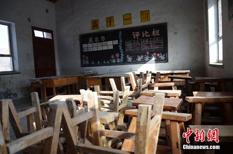位于甘肃平凉市静宁县山区里的一所乡村小学里,原有的百余名学生逐年锐减,至目前只剩下两名学生。除一间教室仍在使用外,其余的教室均被闲置。图为闲置的教室。冯志军 摄