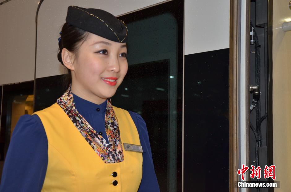 12月17日,记者登上厦深铁路试运行列车,全程体验闽粤千里“一线牵”。全长502公里、设计时速250公里的厦深铁路将于近日开通,该铁路连接中国福建、广东两大侨乡,串起深圳、汕头、厦门三大经济特区,是中国“四纵四横”快速客运网中一纵——东南沿海铁路的重要组成部分。图为可以媲美空姐的高铁乘务员。中新社发 郭军 摄
