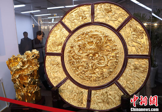 12月18日,在位于南京鼓楼绿地广场的海棠艺术馆开馆展览上,雕刻着九条龙的金色艺术品随国内众多名家的近百件绘画、雕塑、书法作品一同亮相。中新社发 泱波 摄