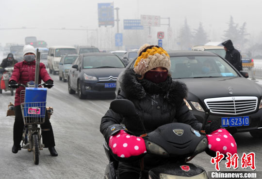 图为石家庄市民出行,穿戴得严严实实。中新社发 翟羽佳 摄