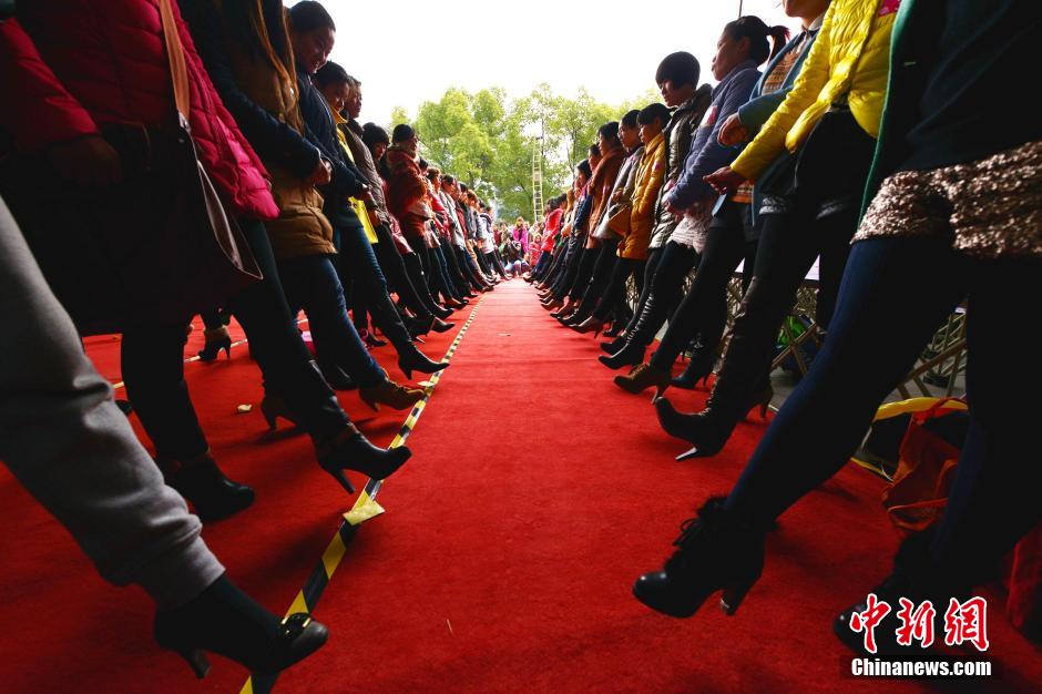 3月8日,无锡百余名女性穿着高跟鞋参加为“三八妇女节”特制的“高跟鞋女王”趣味比赛。前来参赛的选手必须穿上六公分以上的鞋子,以独脚站姿保持不动,坚持时间最久的选手即可晋级参加下一轮比赛,该赛以淘汰制角逐出“女王”。中新社发 李一芳 摄