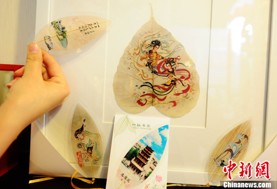 今年年初,一家名为“丝路坊”的文化创意小店在人流密集的兰州市城关区大众巷开张了。店内一个个精致的工艺品,或时尚、或朴拙,背后都有一段动人的故事。图为用树叶制作的具有敦煌元素的书签。中新社发 杨艳敏 摄