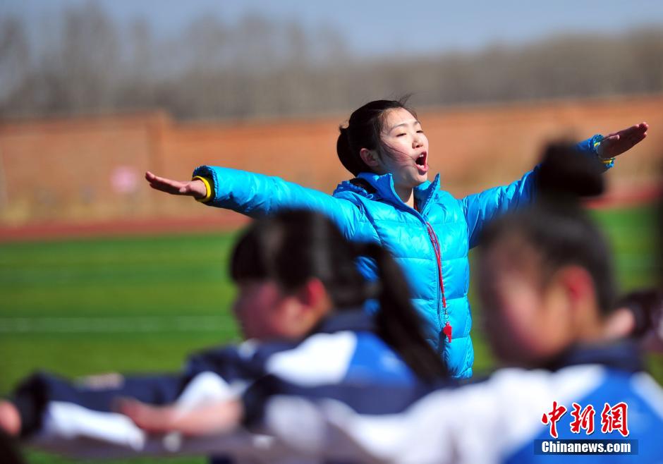 3月12日,在辽宁省沈阳市康平县小城子九年一贯制学校,首次迎来女体育老师,沈阳体育学院大三学生简竹正在给学生们上体育课。日前,沈阳体育学院90名大三学生,奔赴沈阳四个郊县的中小学进行体育教育志愿支教活动。这是沈体大学生连续第二年和农村孩子的体育课摸爬滚打在一起。据了解,90名学生的志愿支教活动将持续半年,他们将在新民、辽中、法库、康平四个沈阳郊县的中小学扎根六个月,直接参与到体育课教学、大课间、课外体育活动、课余训练、体育竞赛组织和学生体质健康测试等工作中。中新社发 于海洋 摄