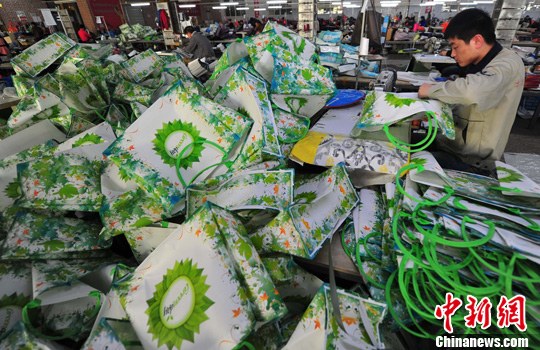 3月12日,沈阳市康平县的一家塑编公司生产车间里,工人正在紧张工作。在国内同行业塑编出口订单减少的情况下,康平县塑编企业订单不减反增。推出了在国际上有竞争力的塑编新产品,100%是出口订单,新产品开辟了欧洲市场。吸引大量城市生产力到这里打工。中新社发 于海洋 摄