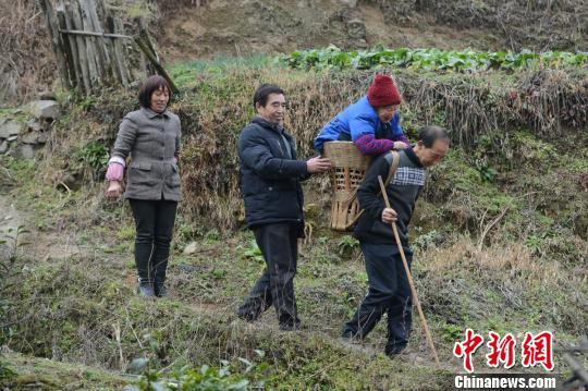 四儿子向明迁背着母亲走在山路上 王永胜 摄