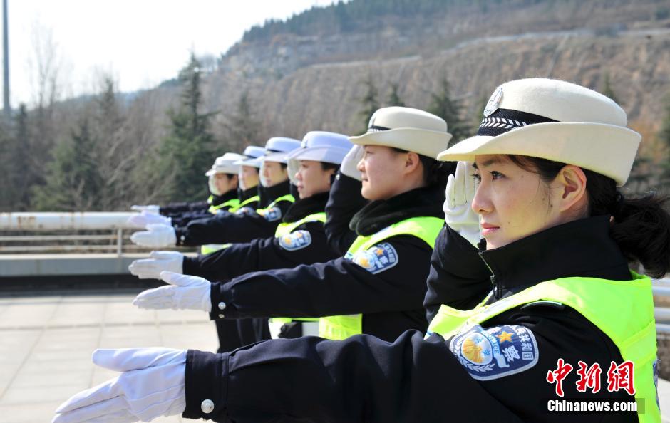3月13日,在“国际警察日”来临之际,济南历下交通警察大队民警集体亮相济南奥体中心开展岗位练兵比武。女交警标准的执勤手势,吸引不少民众围观。图为女交警展示执勤手势。中新社发 张勇 摄