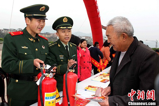 3月14日,福建上杭消防官兵教民众辨别真假灭火器。在“3.15国际消费者权益日”到来之际,上杭消防大队将联合工商、质监等部门,针对辖区消防器材经营点和群众举报的打假线索,开展消防产品检查取缔行动,坚决打击一批消防产品违法行为。中新社发 王东明 摄