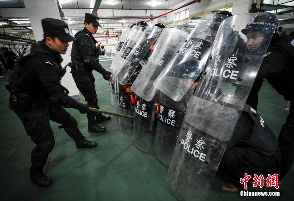 3月14日,新疆乌鲁木齐市赛马场片区管理委员会辖区50余名社区巡逻队员来到特警八支队室内训练馆,特警队教官针对巡逻队员所配发的巡逻器具进行强化训练,并对日常巡逻中遇到的突发情况处置进行讲解、示范,借此增强社区巡逻队员在处置突发事件时的快速反应、团队协作能力,以及自我防护能力。图为特警队教官指导社区巡逻队如何利用盾牌形成有效的防护队形。刘新 摄