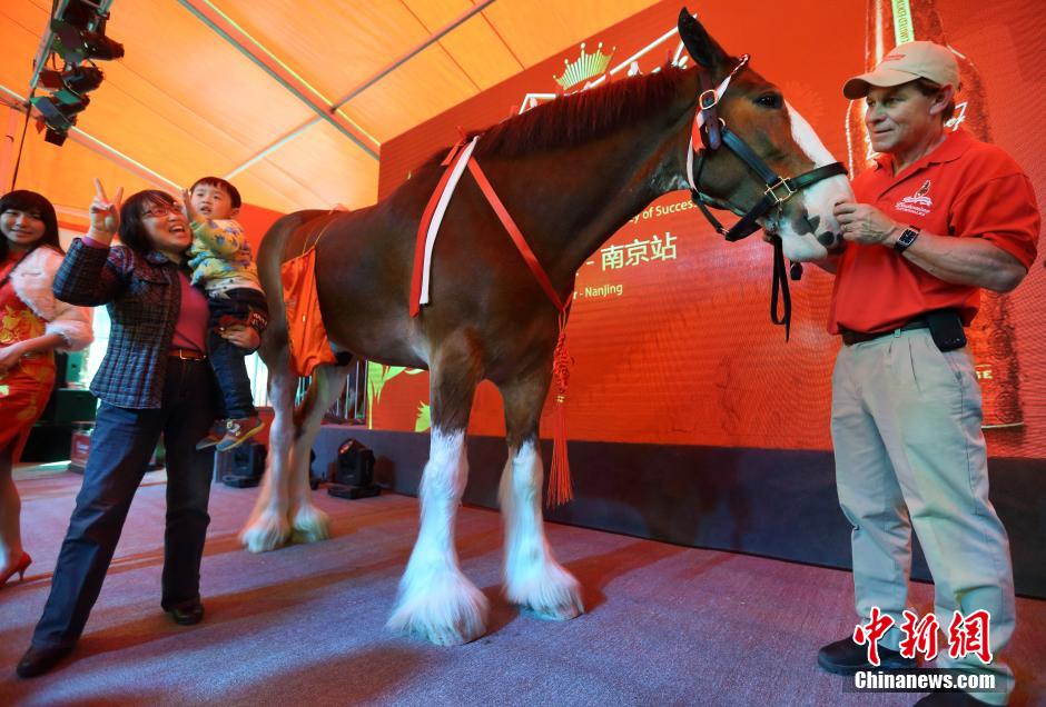 3月15日,南京市民与世界最高大马零距离互动。当日,两匹世界上最高大的马种百威克莱兹代尔马佩戴大红中国结现身南京河西万达广场,以全球欢庆大使的身份,将“马到成功”的美好祝福送给当地民众。据了解,这两匹马自2013年12月从美国圣路易斯启程,携带大洋彼岸的福袋开启了赴华之旅,先后抵达北京、广州、福州、温州以及上海,最后一站南京,总行程达4210公里。百威克莱兹代尔马是世界上最高大雄壮的马种,成年后身高可达1.8米左右,最高可达2米,它不仅有着令人羡慕的身高和油亮的毛发,在它们四肢上更有雪白且细长的从毛,从远处看就像踏在雪地里一般,非常漂亮。