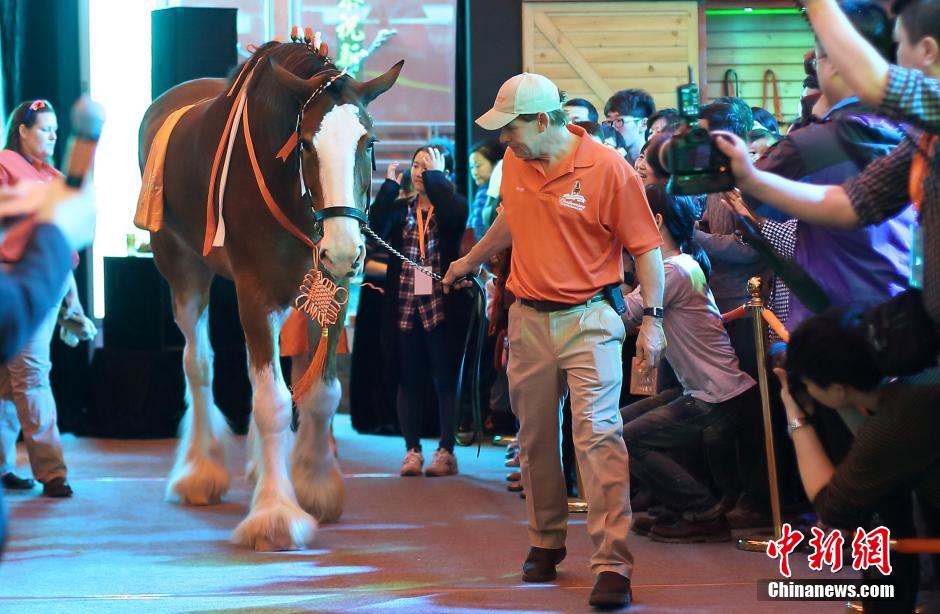 3月15日,南京市民与世界最高大马零距离互动。当日,两匹世界上最高大的马种百威克莱兹代尔马佩戴大红中国结现身南京河西万达广场,以全球欢庆大使的身份,将“马到成功”的美好祝福送给当地民众。据了解,这两匹马自2013年12月从美国圣路易斯启程,携带大洋彼岸的福袋开启了赴华之旅,先后抵达北京、广州、福州、温州以及上海,最后一站南京,总行程达4210公里。百威克莱兹代尔马是世界上最高大雄壮的马种,成年后身高可达1.8米左右,最高可达2米,它不仅有着令人羡慕的身高和油亮的毛发,在它们四肢上更有雪白且细长的从毛,从远处看就像踏在雪地里一般,非常漂亮。