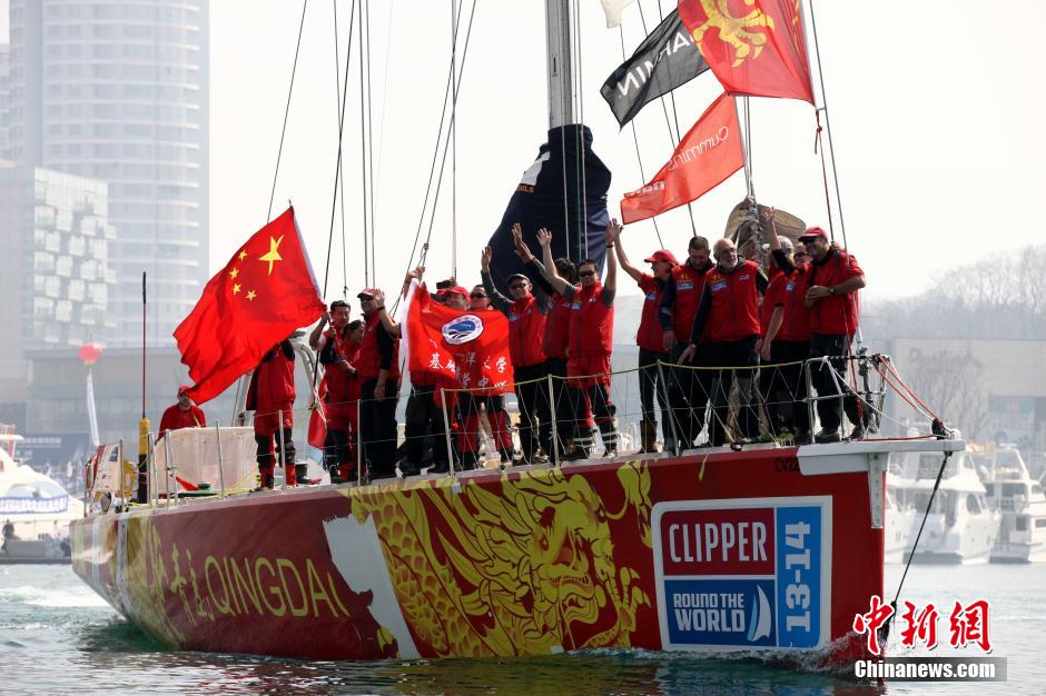3月16日中午,参加 2013/2014克利伯环球帆船赛的“青岛号”赛船缓缓驰离青岛前往美国旧金山,开始第六赛段的征程。青岛民众在奥帆中心码头,敲锣打鼓为“青岛号”送行。 截至第五赛段,英国“拉赫兰顿”号暂居榜首,“航海爵士”号、“德里·伦敦德里·多利”号紧随其后位居二、三位,中国“青岛”号落后第一名21个积分位列第六。中新社发 徐崇德 摄