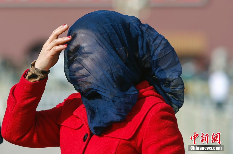 3月17日,天安门广场一名游客用纱巾把头部包裹起来。当天,五级左右北风白天“造访”北京,局部地区出现扬沙。中新社发 张浩 摄