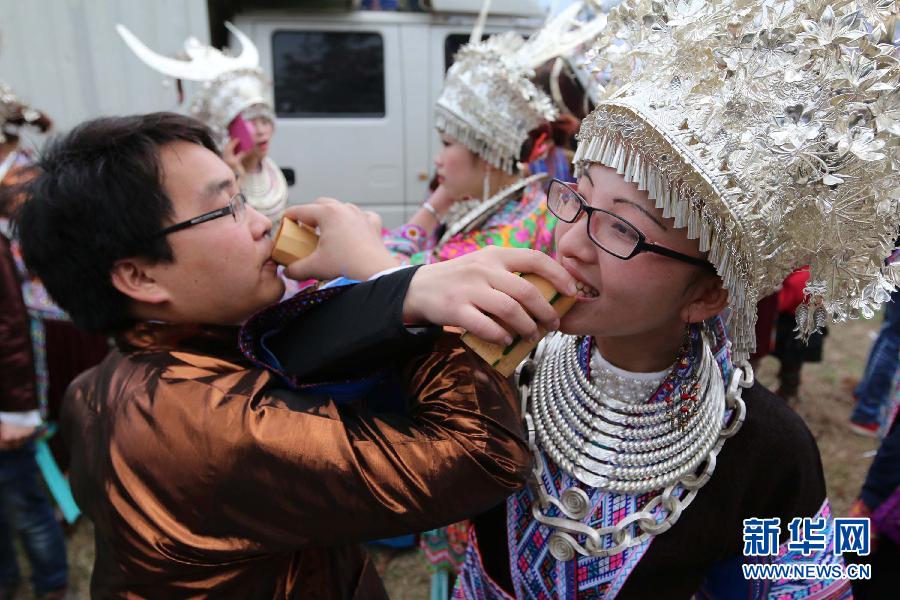 3月19日,在广西柳州融水县白云乡社场,两名青年在共进午餐时喝交杯酒。当日是广西融水“春社”后的第一天,广西柳州融水县融江片各族青年汇聚白云乡社场,或寻找意中人,或与恋人约会,到处洋溢着浓郁的浪漫气息。据了解,“春社”是旧时春季祭祀土地神的日子,也是广西融水县融江片苗家的传统相亲时节,活动自春社日起持续4天时间。青年男女来到社场聚会,通过这种传统方式寻找意中人。新华社发(龙涛 摄)