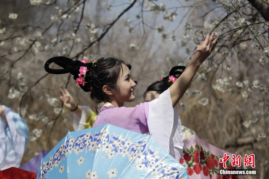3月20日,河南郑州二七区樱桃沟,万亩樱桃花竞相开放,花香四溢,高挑的美女模特打扮成花仙子造型,在花海中穿行,走吊桥、闻花香,甚至在坎坷的土路上猫步走秀,繁花锦簇令仙子们若隐若现更增添了一丝不食人间烟火般的飘渺。中新社发 王中举 摄