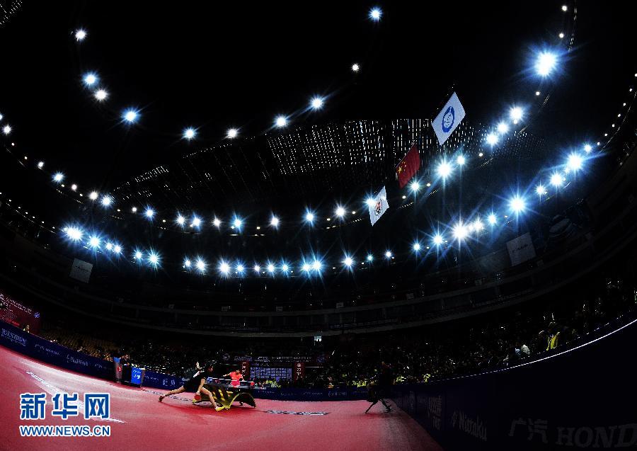 3月22日,中国选手丁宁在比赛中发球。当日,在第27届亚洲杯乒乓球赛女单决赛中,丁宁以4比2战胜队友李晓霞,获得冠军。 新华社记者肖艺九摄