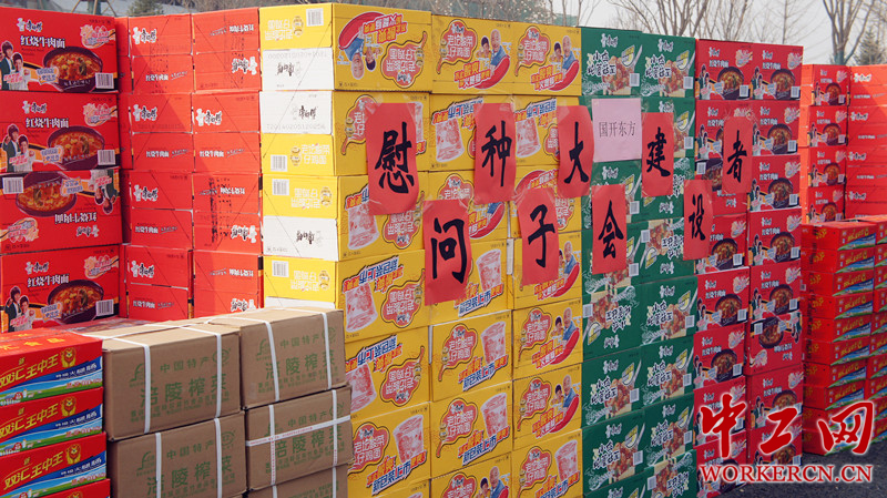 2014年3月22日,丰台区总工会一行来到青龙湖国际会展酒店工程工地。青龙湖国际会展酒店是2014年世界种子大会的重要配套设施之一,目前近2400名工人日夜奋战在建设工地。图为丰台区总工会为一线建设者送来的12万元的慰问物资,其中包括方便面1700箱,榨菜80箱,火腿肠300箱。中工网记者 葛姗 摄