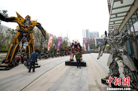 图为“大黄蜂”等机器人现身苏州街头,吸引过往路人的关注。王思哲 摄