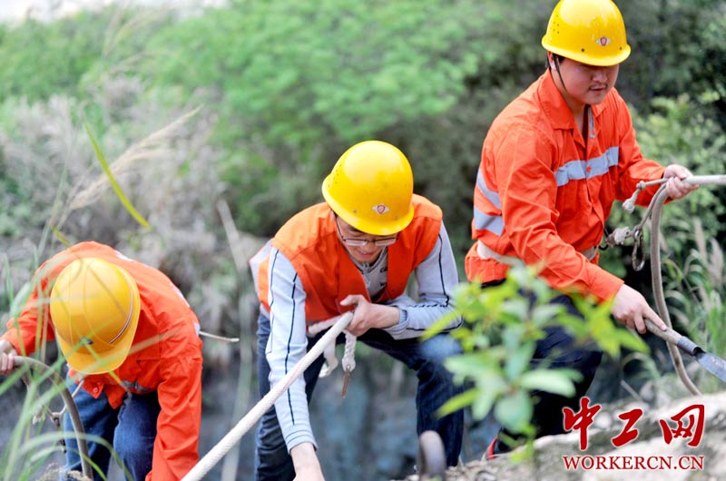 3月26日,工长李小超带领工友们上山巡查山石。他们来到漳龙k43+500-900公里处检查护坡状况。从检查道往山顶上攀登,坡度约为80度。到了山顶,他们把拇指粗的绳子固定在树上,系好安全带,撒渔网般把绳子甩向山下,然后双手拽绳,迅速攀援而下,双脚蹬住护坡,手中柴刀起起落落。砍伐树木和杂草后,又一点点仔细检查护坡有无裂缝、坍塌等隐患。