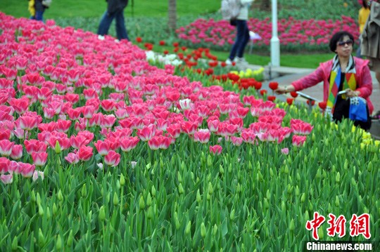 3月29日,浙江宁波鄞州区湾底村村天宫庄园办了一场荷兰郁金香名品花卉展,展览引进荷兰、美国、德国等国际一流花卉专业种苗公司的四大色系102个郁金香品种,吸引了大量的游客。中新社发 徐小勇 摄