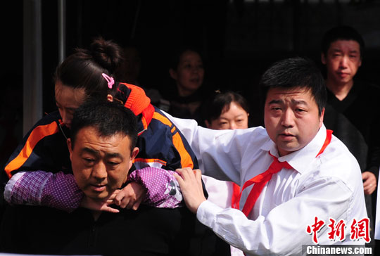 3月31日,老师在演练中背着“受伤”学生向安全区域转移。中新社发 于海洋 摄