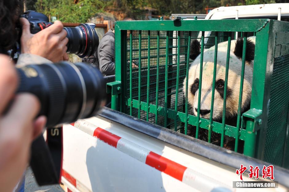 3月31日,汶川地震时送到昆明寄养的大熊猫美茜返回雅安碧峰峡大熊猫繁育基地。6年前,由于汶川地震使大熊猫家园受损而送到昆明寄养。据云南野生动物园管理员白拓介绍:“6年前,大熊猫过来时,还是婴儿期,现在体重都超过了100公斤,它们已经7岁了,相当于人类二十二三岁了,是大姑娘了,是谈婚论嫁的年龄了。”图为大熊猫“回家”消息吸引了许多媒体关注。中新社发 任东 摄