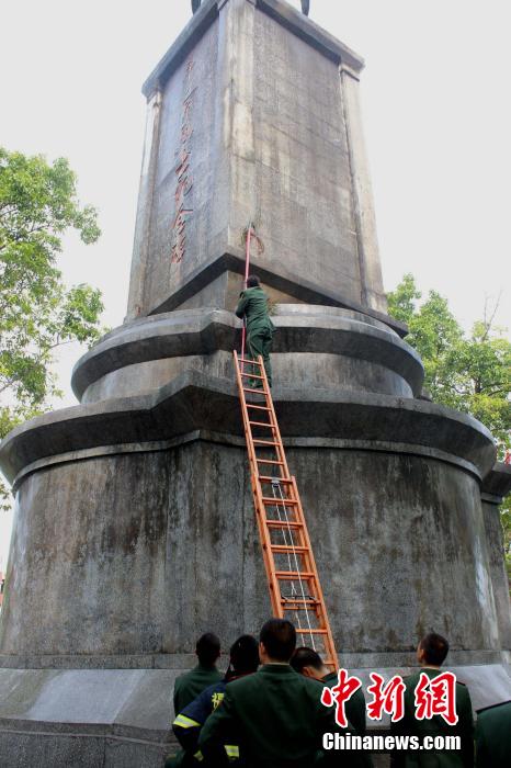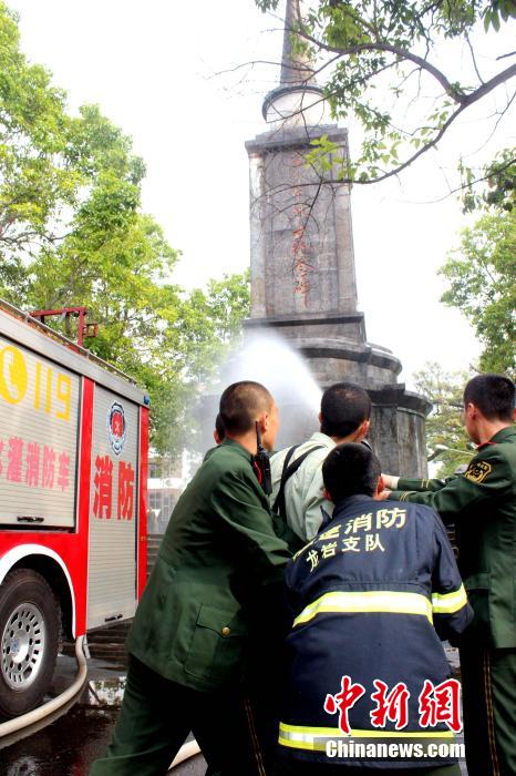 清明前夕,福建上杭消防官兵冒着大雨来到上杭县革命烈士纪念碑、烈士陵园前,打扫纪念碑卫生、清理杂草,冲刷附近地板,并在周围贴出清明期间文明祭扫的倡议书,拉开了一年一度清明时节祭扫革命烈士纪念碑的序幕。中新社发 王东明 摄