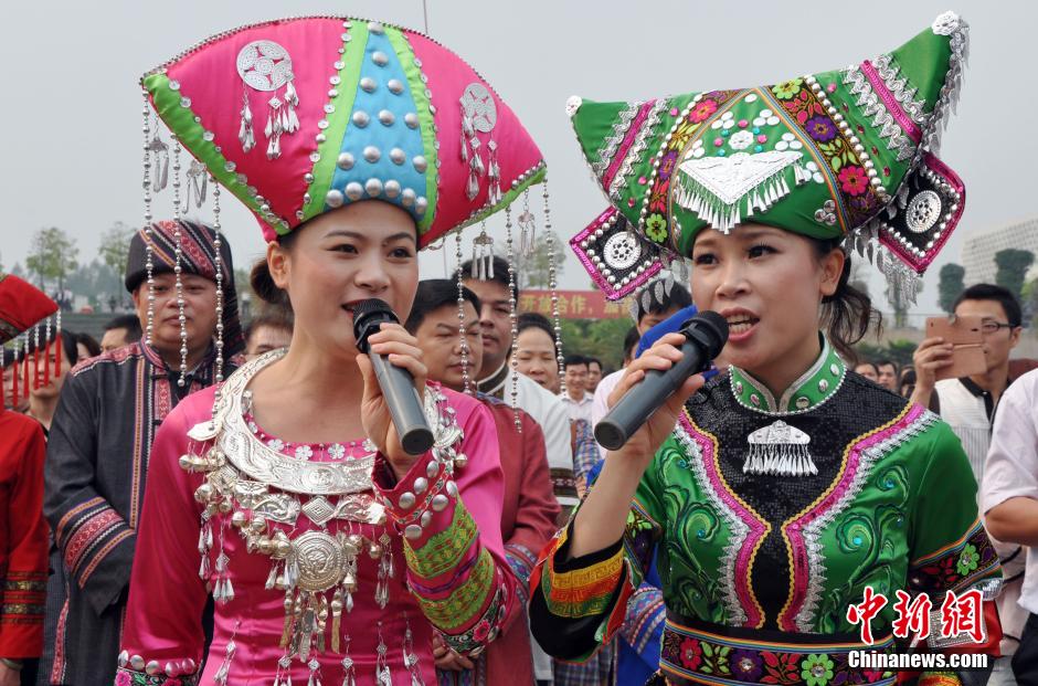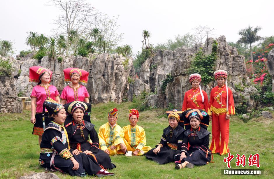 图为崇左市壮族民众身着民族服饰赛山歌。中新社发 黄艳梅 摄