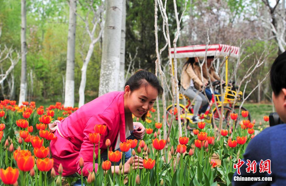 3月31日,春花盛开的济南植物园为初暖乍寒的泉城增添了几分温馨、芳香,民众结伴前来赏花踏青,尽赏济南“潇洒似江南”春色。图为“美眉”与花争艳。中新社发 张勇 摄
