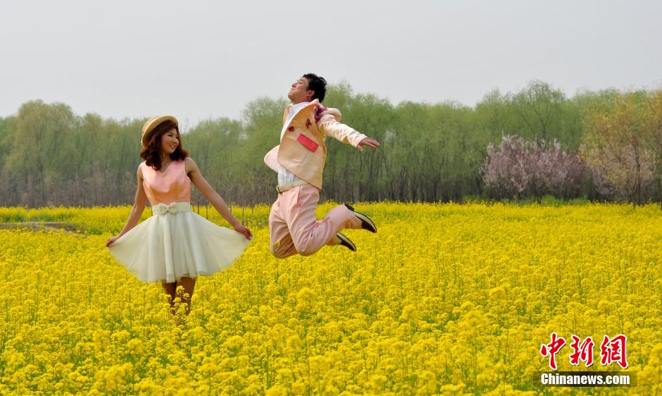 3月31日,春花盛开的济南植物园为初暖乍寒的泉城增添了几分温馨、芳香,民众结伴前来赏花踏青,尽赏济南“潇洒似江南”春色。图为一对情侣摆酷拍婚照。中新社发 张勇 摄