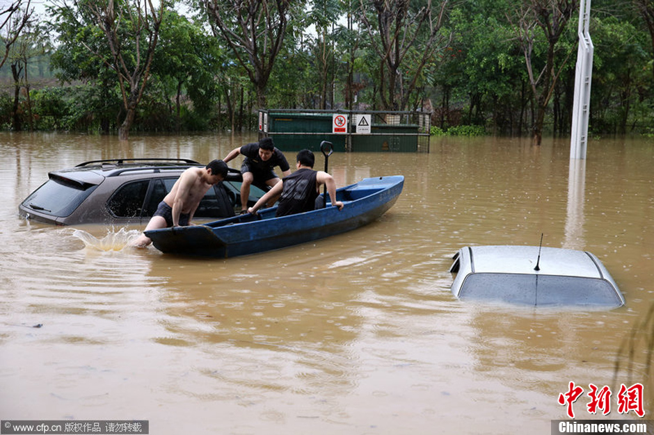 广东东莞暴雨后内涝严重 宝马车被困积水中20小时