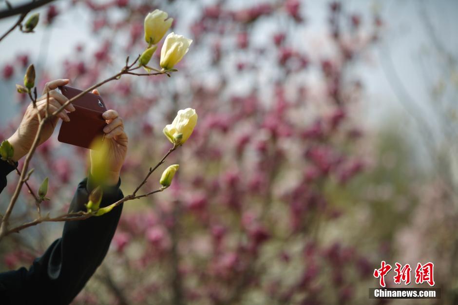 4月1日,一位市民在北京国际雕塑公园内有手机拍摄盛开的玉兰花。作为石景山区春季主打旅游活动之一的2014踏青季暨第十一届玉兰文化节在北京国际雕塑公园举办,5000余株玉兰吸引不少市民到此赏花。石景山区春季旅游活动由石景山区旅游委、石景山区公园管理中心共同主办,由石景山区各主要景区点承办,活动主题为“踏春品香石景山”,时间为4月至5月。中新社发 盛佳鹏 摄