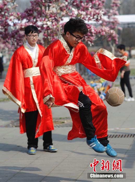 4月1日,两名年轻人在北京国际雕塑公园内表演“蹴鞠”。石景山区春季主打旅游活动之一的2014踏青季暨第十一届玉兰文化节在北京国际雕塑公园举办。中新社发 盛佳鹏 摄