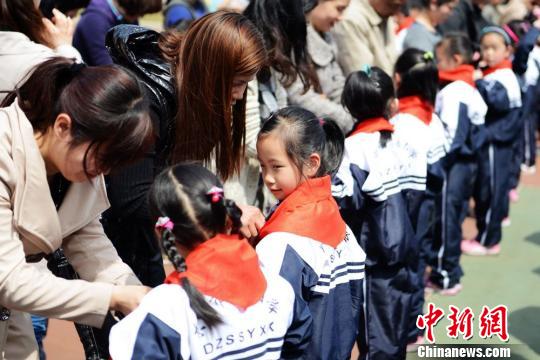 4月1日,苏州市东中市实验小学组织该校一年级230名学生,举行“领巾飘扬,放飞梦想”少先队入队仪式。现场邀请全体家长为学生佩戴红领巾,还将写有希望与祝福的纸飞机扔向空中,放飞梦想。图为家长们为自己孩子佩戴红领巾。王思哲 摄