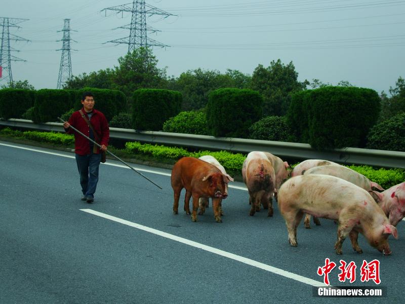 2014年4月1日10时28分,杭金衢高速兰溪和金华之间有一辆运载41头生猪轻型仓栅式货车右后轮发生炸胎,随后发生翻车事故。“八戒们”在高速上大逃亡,高速交警金华支队执勤民警第一时间前往现场处置。事故发生后,高速交警立即对道路实行了封闭措施,通知施救人员到达现场进行施救。几分钟后,正巧一辆道路施工的车辆经过此地。大家一起帮忙抓猪,大家推的推,拉的拉,追的追,赶的赶。在众人的合力营救下,历时1个多小时,终于将“二师兄”请上了车。将事故的损失降到了最低,高速公路很快恢复了通行。