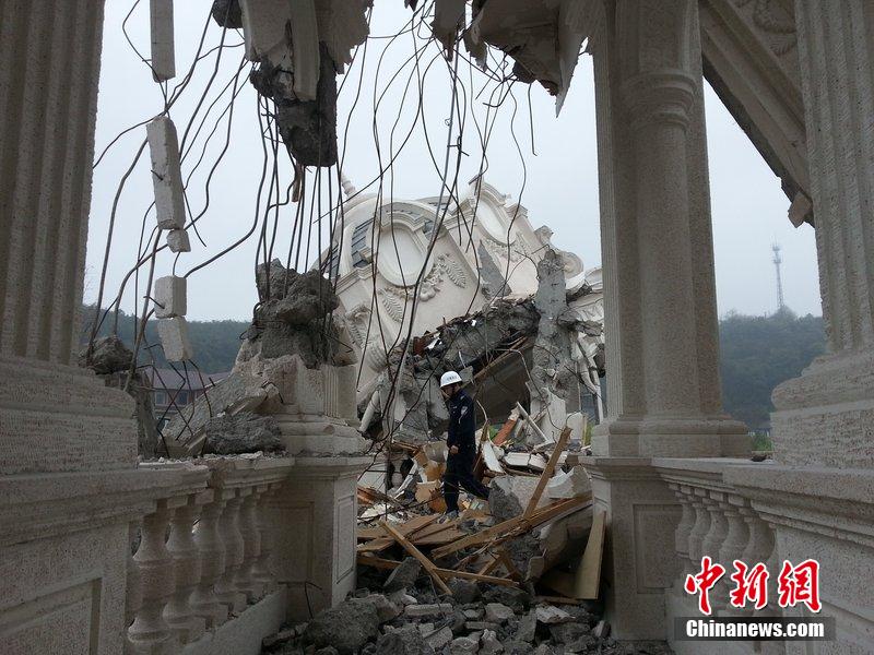 2014年4月1日,浙江绍兴上虞区梁湖镇高档小区天香华庭内,一幢改装成“白宫”似的豪华别墅的围墙、围廊及亭台等明显的违法建筑,被强制拆除后剩下断垣残壁,在浙江省督导组的介入下,该住宅小区违法建筑的综合整治才得以全面展开。包敦远 摄