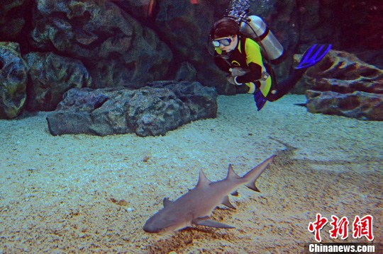 4月1日,饲养员与柠檬鲨在水中亲密接触做适应性训练。中新社发 佟郁 摄