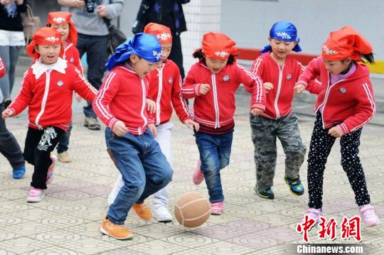 4月2日,苏州市虎丘中心幼儿园开展“春暖花开,话清明”活动,组织小朋友进行传统“蹴鞠”比赛,在欢乐的比赛中,体验中国的清明文化。图为小朋友们进行“蹴鞠”比赛。王思哲 摄