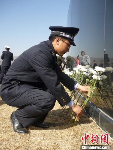 4月1日,内蒙古公安厅在公安英烈纪念园举行祭奠公安英烈活动。图为民警在纪念碑前献花。中新社发 董乐 摄
