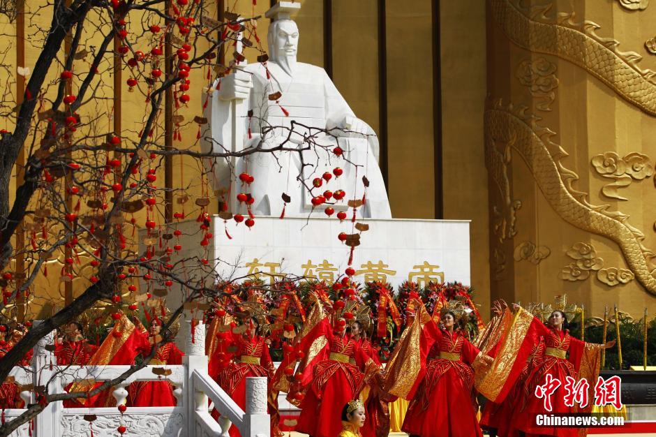4月2日上午,乐舞祭拜人文始祖黄帝。当日,甲午年黄帝故里拜祖大典在新郑市黄帝故里景区举行。大典沿承规制,共有“敬献花篮”“净手上香”“祈福中华”“高唱颂歌”等九项仪程。中新社发 王中举 摄