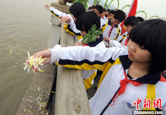 4月2日,清明节将至。50多位参加纪念沈葆桢巡台140周年·船政名杰后人海祭先贤活动的福州中学生代表,沿福州马尾船政江滨廊道向闽江江面撒花瓣,寄哀思。中新社发 刘可耕 摄