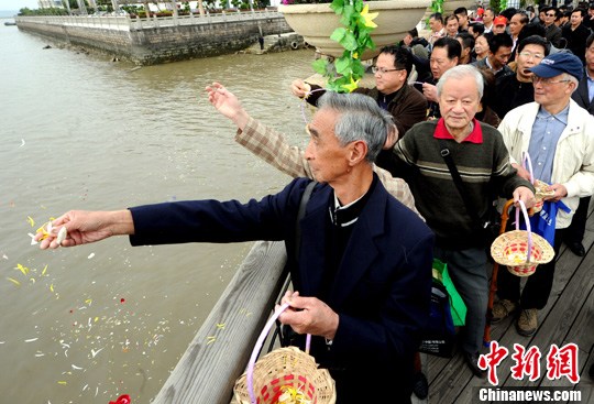 30多位参加纪念沈葆桢巡台140周年·船政名杰后人海祭先贤活动的船政名杰后人代表,沿福州马尾船政江滨廊道向闽江江面撒花瓣,寄哀思。中新社发 刘可耕 摄